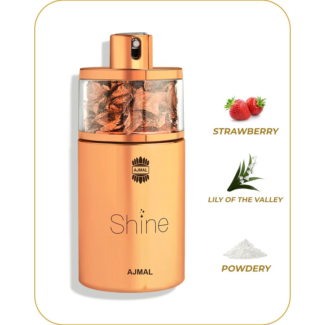 Shine EDP Perfume for Women by Ajmal is the fruity, floral scents of Shine is an intriguing blend of bold and vibrant notes. Shine was launched in 2017. Created for the shimmer inspired young women, charming and contemporary idol and just as enchanting. As soft and enveloping as skin. Completely addictive and glitterati filled. Top Notes: Strawberry and Pomegranate; Middle Notes: Peony and Lily-of-the-Valley; Base Notes: Powdery Notes and Woody Notes.